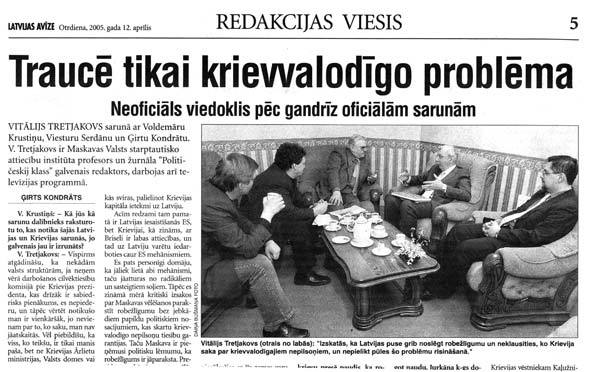 В один и тот же день – во вторник 12 апреля две крупнейшие латышские газеты словно бы сговорились поменяться ролями. Latvijas avīze, известная своей непримиримой, сугубо национальной направленностью, опубликовала спокойное, без присущих ей провокаций и язвительных комментариев интервью с Виталием Третьяковым, профессором Московского Государственного института международных отношений, главным редактором журнала «Политический класс». И в этот же день обычно сдержанная и взвешенная в своих оценках и позиции Neatkarīgā напечатала статью академика Яниса Фрейманиса под красноречивым заголовком «Деколонизация – воображаемая и возможная».