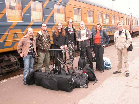 На вокзале российских рокеров встречали организаторы концерта – сопредседатель молодежной организации ЗаПЧЕЛ Жанна Карелина и координатор проекта «Прямое включение» Юрий Петропавловский (справа).