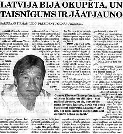 Интервью большое, но главная его интрига – в послесловии. Выясняется, что интервью, цитирую, «организовал Александр Кирштейнс, друг Гунара Кирсонса». Не только организовал, но и дал добро на его публикацию. С какой, спросите, стати? А с той, что в DDD пришло «странное», как пишет газетка, письмо от вице-президента LIDO Цирулиса. Он слезно просит не печать интервью, поскольку, опять цитата, «по вопросам, которые в политическом или национальном аспекте могут трактоваться по-разному, мы не можем давать своих комментариев». А также, что «комментарии к столь чувствительным вопросам, обсуждаемым в беседе с господином Кирсонсом, означают потери для бизнеса» и что «потери будут не только материальные, но и моральные, поскольку на нашем предприятии работают представители разных народов».