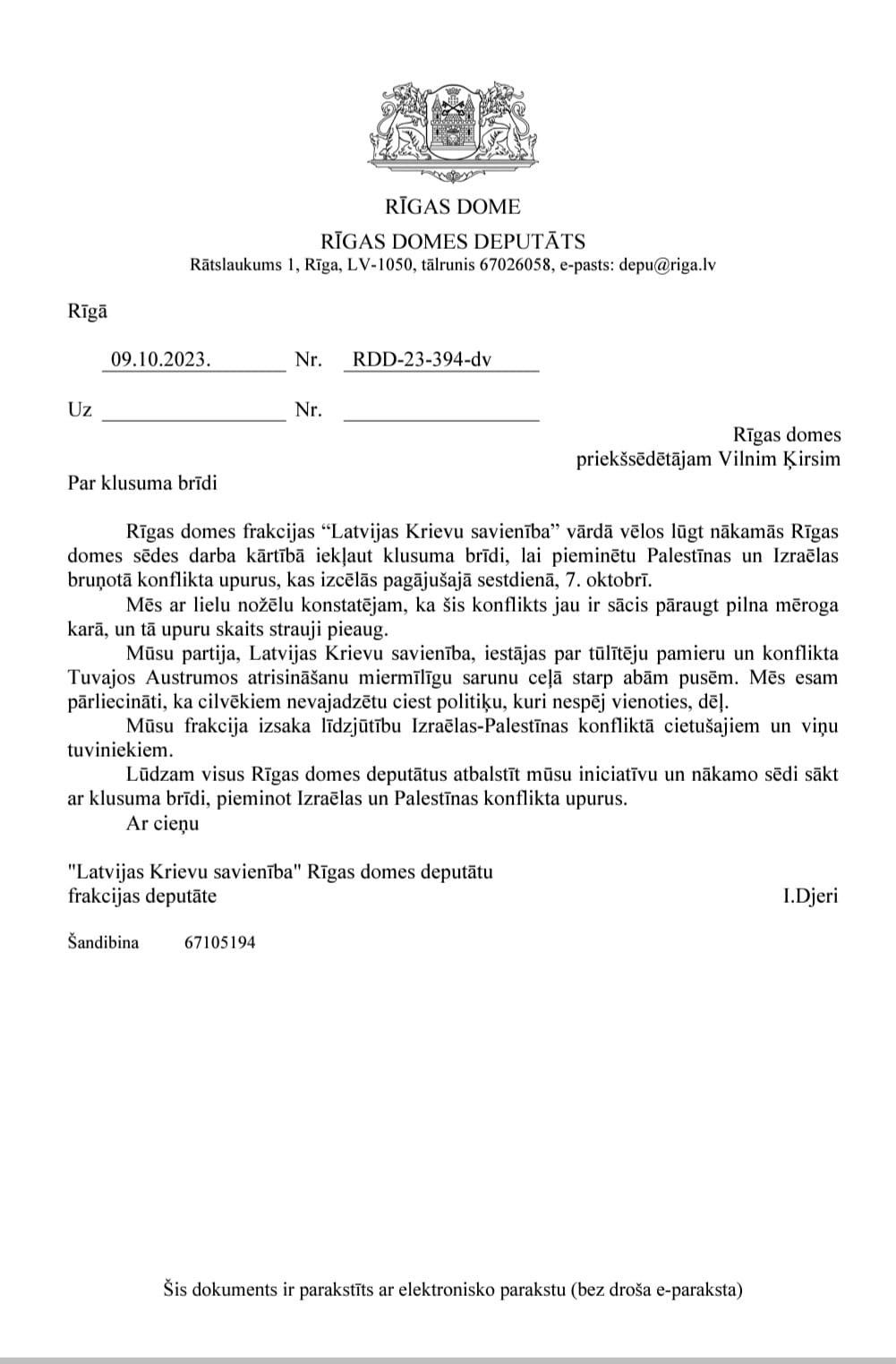 The deputies of the Riga Council on behalf of the Latvian Russian Union initiated a minute of silence in memory of all victims of the armed conflict which got unleashed between Palestine and Israel.
