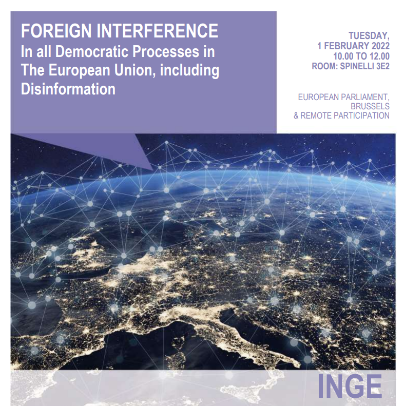 The hearing at the European Parliament was held on February 1, 2022. It was chaired by Raphaël Glucksmann, the leader the Special Committee on Foreign Interference in all Democratic Processes in the European Union, including Disinformation (INGE).