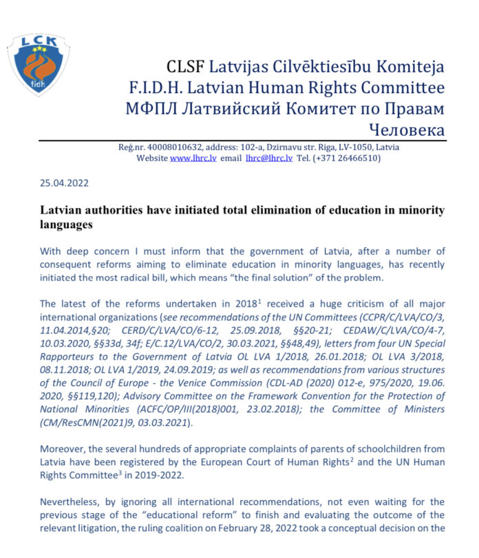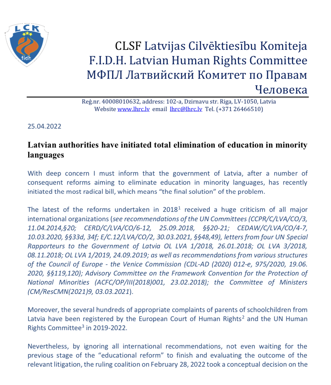 Library Latvian authorities have initiated total elimination of education in minority languages 26.04.2022 725 READ MORE Share: