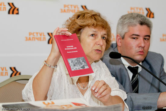 Татьяна Жданок с книгой ‘Геноцид осетин: 1920’, изданной на английском языке