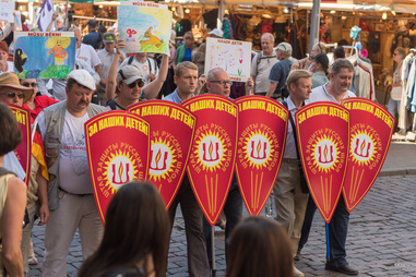 Впереди шли уже привычные для подобных акций барабанщики, а за ними – шеренга щитоносцев с надписями на щитах: За наших детей.