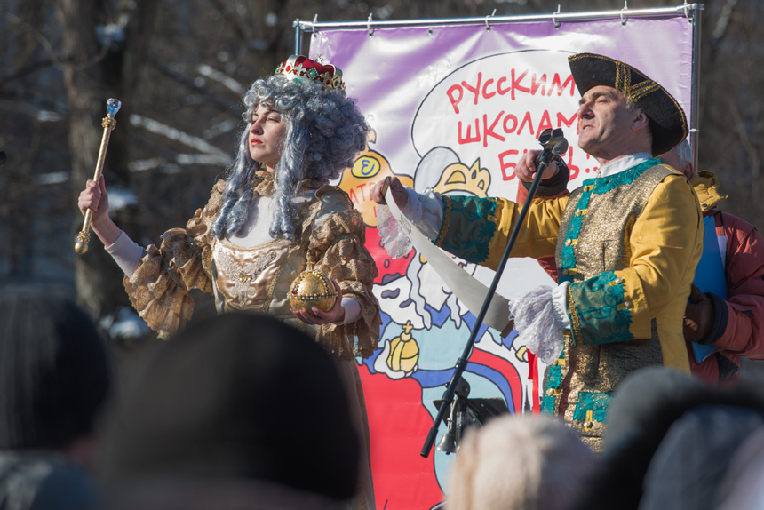 Союзником тех, кто защищает право на образование на родном языке, неожиданно оказалась императрица Екатерина Великая. На митинге было разыграно театрализованное представление, в ходе которого основательница первой русской школы в Риге (точнее, изображавшая ее актриса) обратилась к собравшимся. Прозвучали подлинные слова великой императрицы о том, что образование руководствует к жизни добродетельной, что в учреждаемых народных училищах преподавать будут на языке природном. То есть на родном языке учеников.