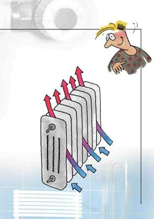 Применение материалов различной теплопроводности, а также распределение температур по плоскости нагрева воздуха позволяет избежать локального перегрева воздуха и образования положительной ионизации, которая неблагоприятно влияет на самочувствие человека. В радиаторах данной конструкции содержится мало воды. Так, в радиаторе длиной 100 см и мощностью 2 кВт содержится теплоносителя всего 0,8 литра. Это позволяет ему при его теплопроводности разогреваться в течение 2–3 минут и реагировать на термозапорный клапан с запаздыванием всего в 30 секунд. При использовании этих радиаторов количество воды в системе уменьшается в десятки раз. Например, в очень большой квартире с общей тепловой мощностью радиаторов 20 кВт даже с учетом емкости трубопроводов и котла во всей системе будет 13–15 литров воды — всего полтора ведра. Ее нагревать и гонять по системе намного легче, чем, например, тонну воды (чугунные радиаторы). Малый вес радиаторов и конструкция навесных креплений позволяет их монтировать даже на тонких гипсокартонных перегородках. Конвекционный радиатор боковыми плоскостями излучает не более 10 процентов своей мощности, остальное отдает конвекцией, поэтому он не будет бесполезно греть стену. Такой радиатор совсем не обязательно устанавливать под окном, он прекрасно работает в любом удобном или подходящим по дизайну месте. При замене батарей все эти тонкости должен разъяснить мастер–сантехник. А вот утеплителям стен не плохо бы начать утепление не с наружи, а изнутри дома и с батарей.