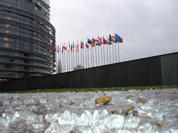 … Утром во вторник 17-го я шел в Европарламент со стороны круглого здания Луизы Вайс. Газон с левой стороны у входа был усеян камнями, палками, оболочками газовых гранат и битым стеклом. Пейзаж после битвы, последствие штурма парламента, предпринятого колонной европейских докеров, протестовавших в понедельник против либерализации портовых услуг.