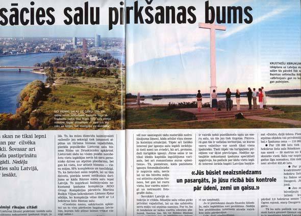 В прямом смысле выплывают. Ибо в Латвии начался бум покупки островов. Это престижно — заявить: «У меня свой остров». Это показатель и материального, и политического положения, пишет Элмарс Барканс в журнале Nedееlla. Сей «крик моды» доносится и с севера, и с юга — из Эстонии и Литвы. Но тамошние покупатели руководствуются иными мотивами…