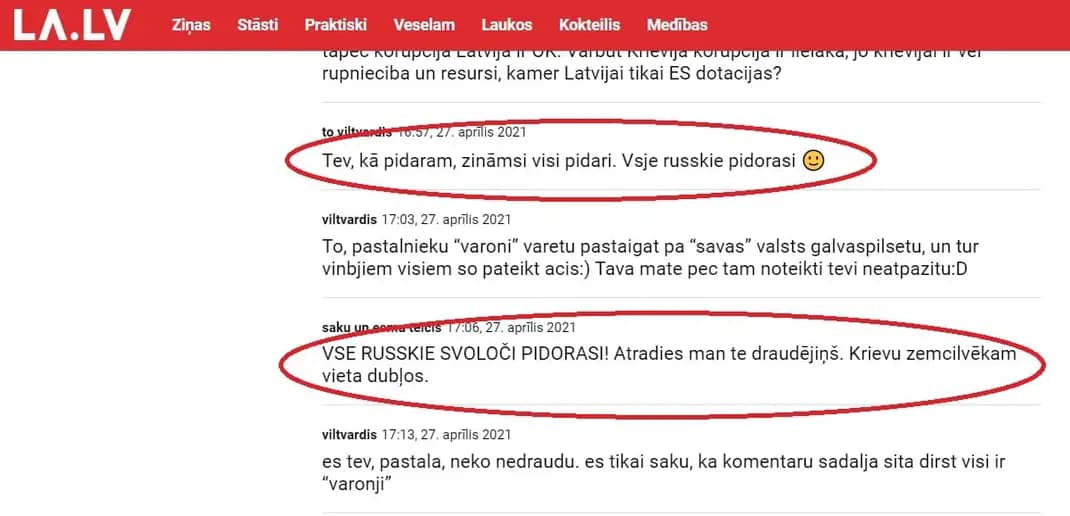Конкретный пример. В апреле прошлого года на платформе «Латвияс авизе» проходила дискуссия, в ходе которой один из участников высказал свое «мнение», что все русские – сволочи, недочеловеки и их место в грязи «…pidorasi… zemcilvēki… svoliči…, kuriem vieta dubļos» https://www.facebook.com/photo?fbid=955666931875159&set=a.252957715479421.