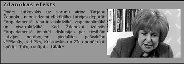 «Илмарс Латковскис пригласил к разговору Татьяну Жданок, безусловно, самого эффективного латвийского депутата в Европарламенте. Она самая активная, самая заметная и самая аттрактивная. Когда Жданок удалось инспирировать в Европарламенте дискуссию о праве неграждан Латвии участвовать в выборах самоуправлений, Пикс, Кристовскис и Зиле (латышские евродепутаты. – Ракурс) очень сильно оппонировали ей. Но, говоря терминологией спортсменов, это была игра от обороны. Нападение и инициатива были в руках Жданок.