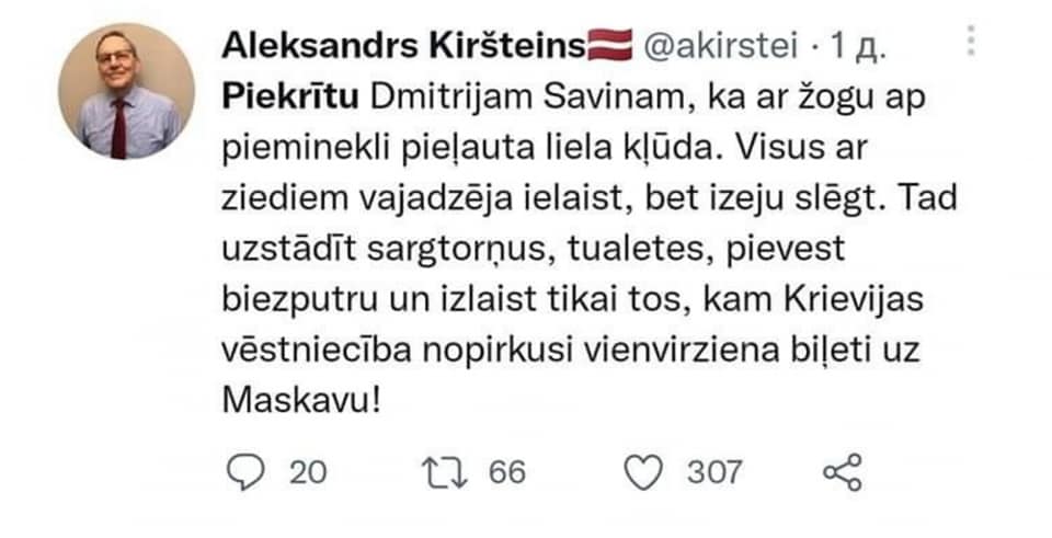На прошлой неделе в твиттере А.Кирштейнс, комментируя ситуацию с забором вокруг Памятника Освободителям Риги, написал: «Всех с цветами нужно было впустить, а выход закрыть. После чего установить охранные вышки, туалеты, привезти кашу и выпускать только тех, кому посольство России купило билет в один конец – в Москву!».