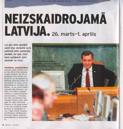 Атис Слактерис вообще пользовался на этой неделе особым вниманием прессы. Главный редактор Nedeella Марис Зандерс в подборке материалов рубрики «Необъяснимая Латвия» процитировал сказанное министром по поводу загрязнения Даугавы нефтью: «А у нас в Ираке еще не такие нефтяные фонтаны били из взорванных трубопроводов»…