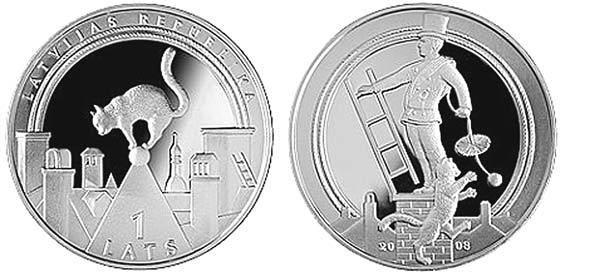 Пока народ латвийский пребывает в беспокойстве по причине обещанного экономического кризиса, Банк Латвии не только сохранаяет, но и крепит олимпийское спокойствие. Например, выпуском вот этой монеты достоинством в 1 лат. Называется она прямо и нелукаво – Монета счастья. Нерушимым залогом нашего с вами счастья выступают милейшие кот на крыше и трубочист работы художника Дайны Лапини, изображенные на серебрянном однолатовике стоимостью в 22,50 лата.
