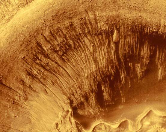 Вода, которая, возможно, выходит на поверхность Красной планеты, испаряется или полностью замерзает за несколько часов или в крайнем случае за сутки. Однако за это время она успевает образовать некое подобие грязевых потоков. И за время своей работы Mars Global Surveyor успел передать на Землю десятки тысяч фотографий различных “оврагов”, видимо, образованных протекавшей водой.