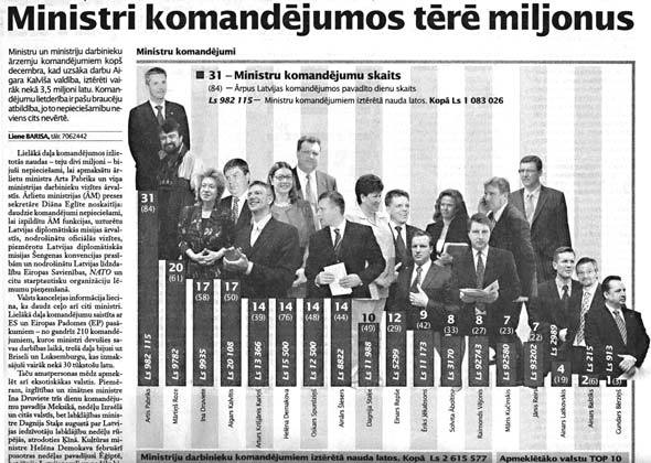 Большая часть расходов – около двух миллионов – понадобилась, чтобы оплатить командировки министра иностранных дел Артиса Пабрикса и сотрудников его министерства. Однако много путешествуют и другие министры. Большая часть командировок связана с мероприятиями ЕС и Совета Европы – из 210 командировок, в которые министры отправлялись в свое рабочее время, третью часть составили поездки в Брюссель и Люксембург, обошедшие в 30 тысяч латов.