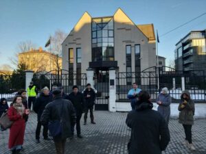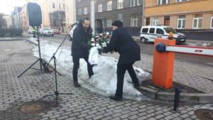 Участники митинга возложили к входу в посольство траурный венок с надписью «литовская демократия». В заключение ведущий митинга, руководитель Антинацистского комитета Алексей Шарипов пообещал: если Альгирдаса Палецкиса не выпустят на свободу, акции протеста у посольства Литвы в Риге будут продолжаться.