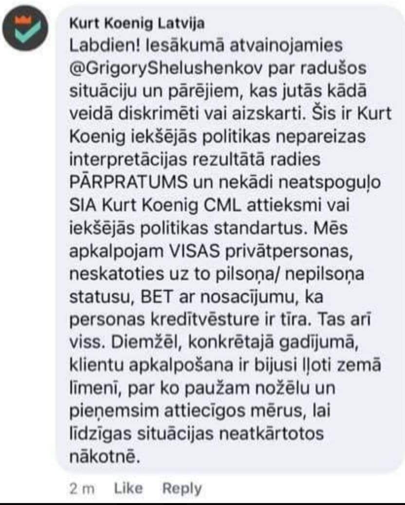 “Я считаю, что такая дискриминация недопустима и не должна замалчиваться! Поэтому сегодня утром я позвонил в Kurt Koening и спросил, обслуживают ли они неграждан. Мне ответили, что не делают разницы между гражданами и негражданами Латвии. Обещали сделать об этом отдельное заявление.