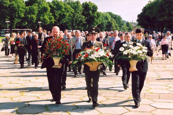 Венки к памятнику возложили дипломаты России и Белоруссии, к подножью монумента легли букеты цветов. На русском и латышском языках звучали песни военных лет в исполнении самих же ветеранов — члена общества блокадников Антонины Лебедевой, ветерана войны Вячеслава Антонова, ансамбля ветеранов 130-го Латышского стрелкового корпуса.
