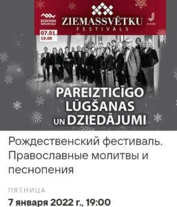 В Юрмале в Малом зале Концертного зала Дзинтари в 19.00 в рамках Рождественского фестиваля концерт, приуроченный к празднованию Православного Рождества. Хор Латвийского радио. Дирижёр: Сигвардс Клява.