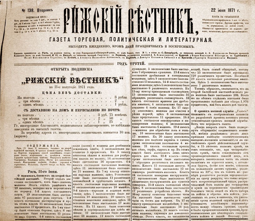 3 января 1859 года вышел в свет номер первой ежедневной рижской русской газеты «Остзейский вестник».