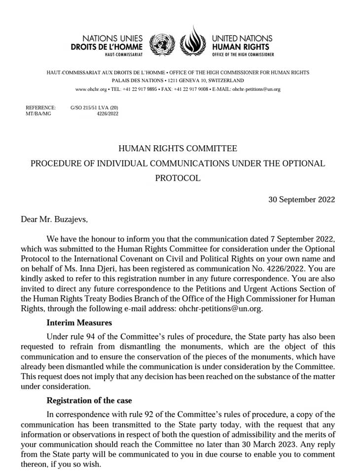 Теперь Латвия будет вынуждена выполнить свои обязательства, взятые при ратификации Международного пакта о гражданских и политических правах, и оставить памятники в покое до рассмотрения сообщения наших депутатов № 4226/2022 по существу.