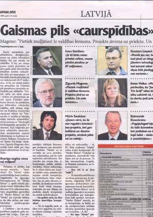 Страсти по ней до сих пор мотают душу многих, но только не председателя правления SIA Merks Ивара Гейданса. Его предложение построить «замок» за хилые 87,6 миллиона латов было отвергнуто 2 апреля. Ссылки на то, что будто бы компания Merks не совсем чиста, похоже, безосновательны. Уголовный процесс не возбужден. Возбуждена разве что Delna (общественная организация, борющаяся, как утверждается, за открытое гражданское общество. — Ракурс). Delna, по сути, и раздула тот самый пожар «на горе всем буржуям…».