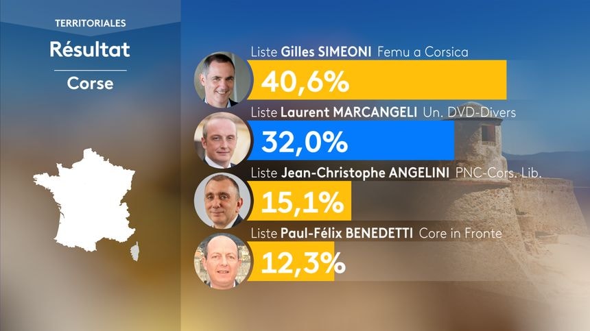 На Корсике, где активность избирателей была гораздо выше (59 процентов), победу одержали регионалисты. Их лидер Жиль Симеони (Femu a Corsica) будет на этой неделе переизбран в качестве президента Корсики.