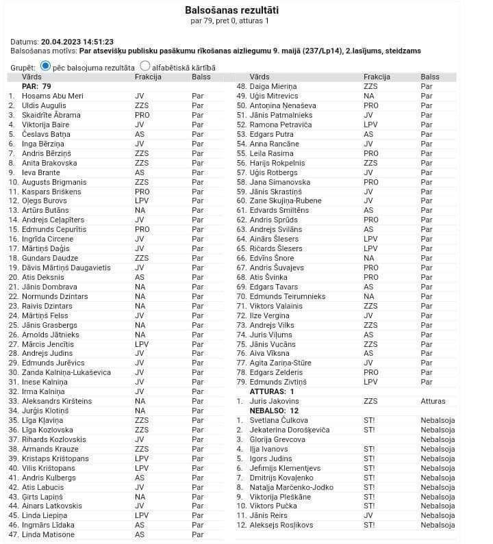 В четверг в Сейме не нашлось ни одного депутата, который проголосовал бы против закона, запрещающего любые праздничные или памятные мероприятия 9 мая. Лишь один-единственный депутат от СЗК воздержался. Не верите? Смотрите распечатку голосования.