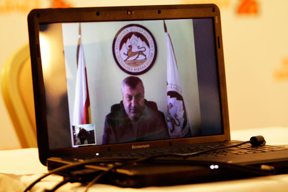 Во время встречи состоялся видеомост с президентом Южной Осетии Эдуардом Кокойты. Глава южно-осетинского государства обменялся мнениями с запчеловцами и представителями общества «Алан», ответил на вопросы. Президент начал свое выступление словами: «Хотел бы поблагодарить всех вас». Он вспоминал Джульетто Кьезу, обсудил с Татьяной Жданок проект договора между ЕС и Грузией о возвращении нелегальных иммигрантов (этот проект затрагивает и интересы жителей Южной Осетии), порадовал членов общества «Алан» информацией о том, что упрощен въезд жителей Латвии в Южную Осетию. Положение в своей стране президент охарактеризовал так: «Почти двадцать лет жители находились в блокаде, думали, как обеспечить свою безопасность. Теперь живем другой жизнью». Корресподент Ракурса поинтересовался, как идет восстановление Южной Осетии. Президент рассказал, что республика находилась в блокаде с 1889 года, в течение мноих лет разрушались коммуникации, инфраструктура. Поэтому восстановление – дело непростое. Но то, что намечено сделать в этом году, будет сделано. Кокойты отметил большую помощь России. «Не Россия разрушала Южную Осетию, это делала Грузия. Но деньги на восстановление выделяет именно Россия», заметил он. Президент обратил внимание на то, что даже природные катаклизмы в самой России, страшные пожары не остановили оказание помощи Южной Осетии. По мнению Кокойты, для Запада это полезная информация к размышлению.