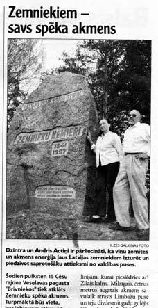 Огромный, в четыре метра высотой, камень был в свое время найден в Лимбажской стороне. Лет двадцать пролежал он в мастерской каменотеса Волдемара Колтова в Цесисе. И вот теперь решено оставить на нем «послание миру об отваге, предприимчивости и решительности крестьян в решающие моменты истории». На камне высечен девиз: «Мы сильны на земле Латвии» и текст: «Крестьянские бунты 1841, 1997». (Zemnieku nemieri 1841, 1997). В 1841 году именно на месте, где установлен камень, самым трагическим образом проявилась солидарность крестьян: они, вооружившись палками и кольями, не дали арестовать своих товарищей, не позволили баронам издеваться над своими женами и дочерьми. В результате со 113 крестьянами безжалостно расправились. 30 апреля 1997 года крестьяне Видземе блокировали у Берзкрогса шоссе Рига – Вецлайцене, требуя, чтобы правительство пересмотрело аграрную политику.