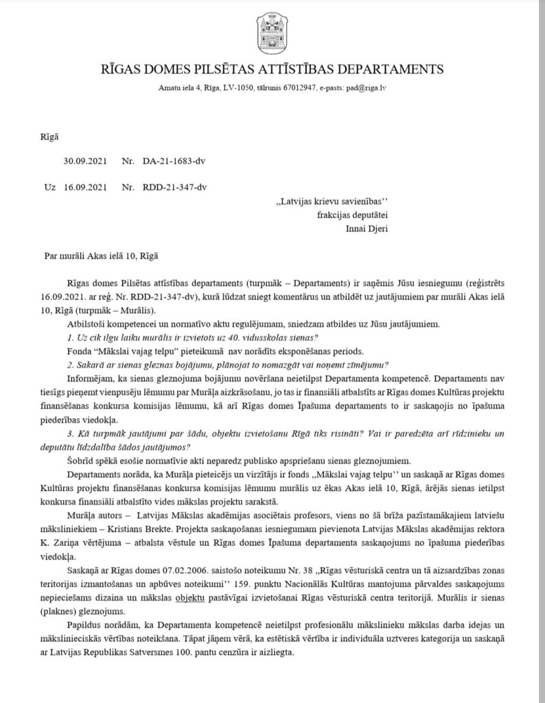 Из ответа следует, что Департамент собственности не проинформирован о том, сколько художество будет находиться на стене школы, согласовывал этот проект без оценки его содержания, а также не имеет права принять решение о закрашивании стены, поскольку проект разработан не ими, а фондом “Mākslai vajag telpu”.
