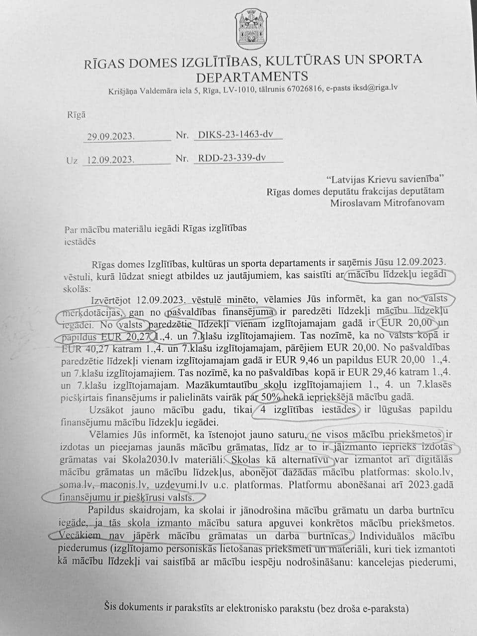 ➡️ покупка школами учебников и рабочих тетрадей оплачивается совместно из государственного и рижского бюджетов. Государство выделило на год 20 евро на каждого ученика в общем, а для учеников 1, 4 и 7 классов – по 40,27. Рижская дума добавила к этому свои 9,46. Для учеников 1, 4 и 7 классов меньшинственных школ финансирование увеличено наполовину по сравнению с предыдущим годом.