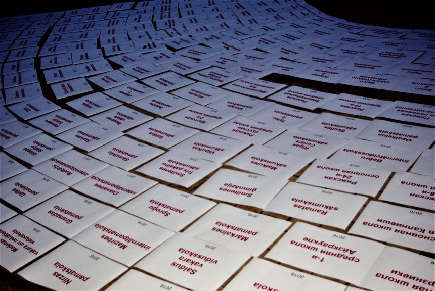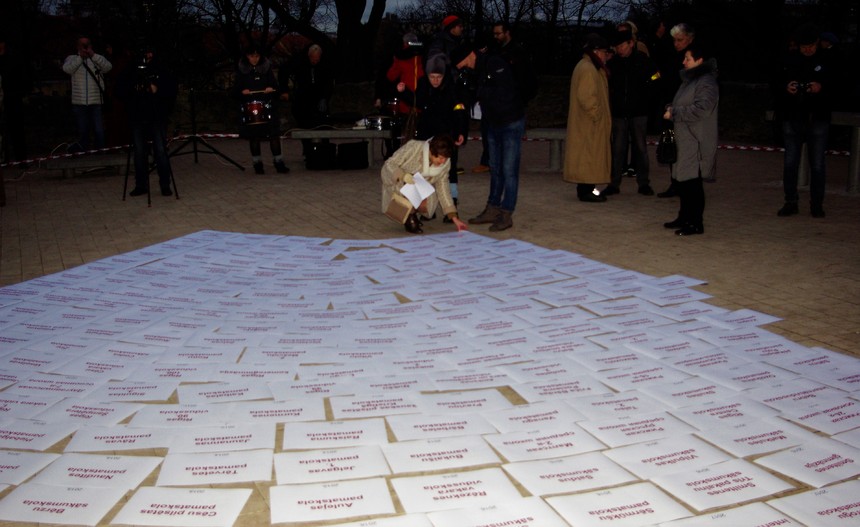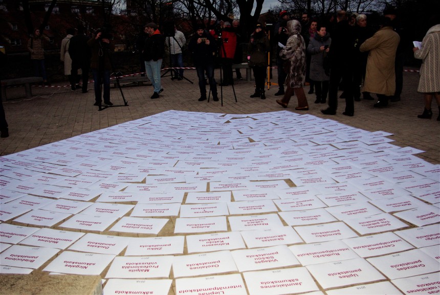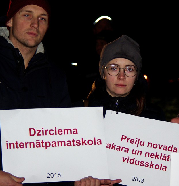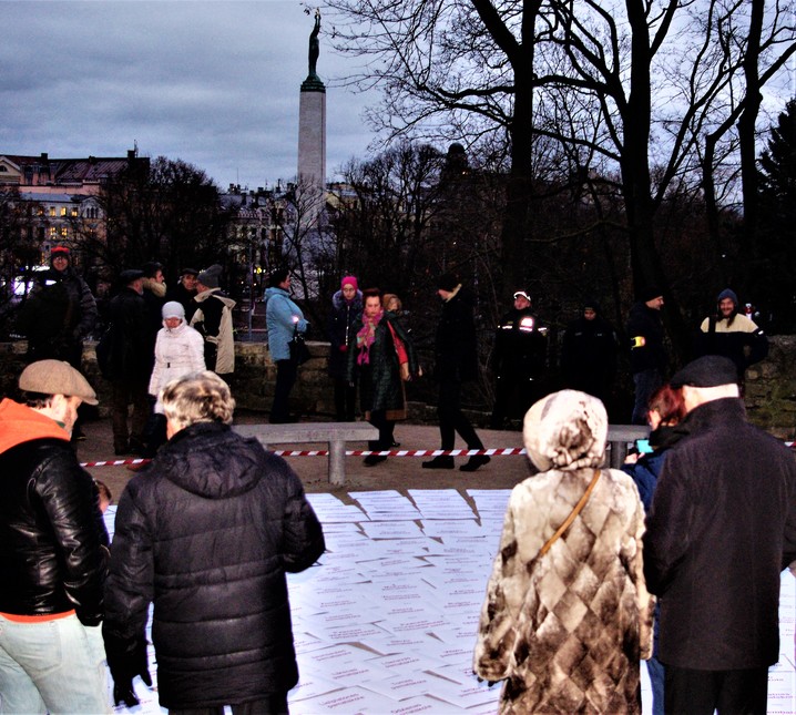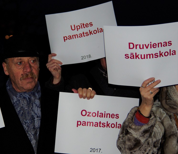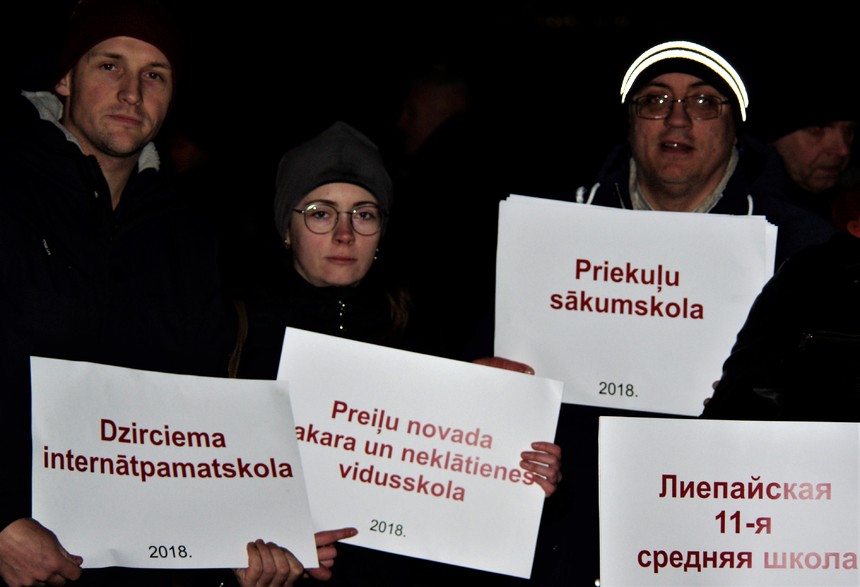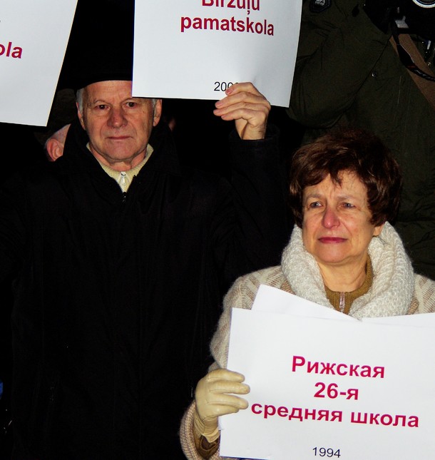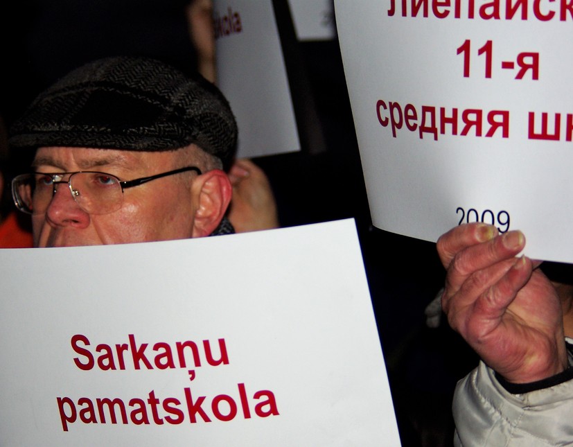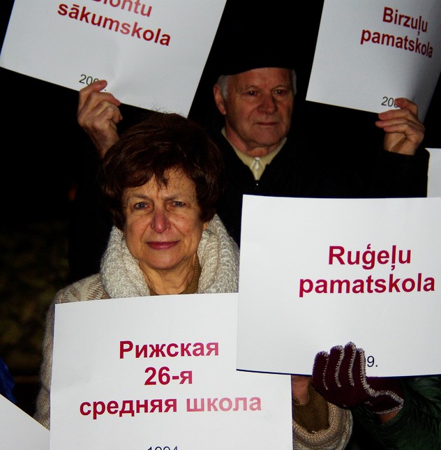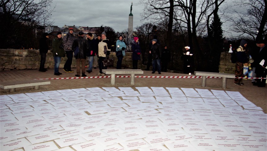 Русский союз Латвии и Штаб защиты русских школ провели в центре Риги флешмоб против массового закрытия школ в Латвии. Участники акции протеста выложили на смотровой площадке Бастионной горки более 250 плакатов с названиями закрытых школ Латвии. Именно столько учебных заведений было ликвидировано в стране за последние десять лет. Ведущими акции протеста были член правления РСЛ Дмитрий Шандыбин (на русском языке) и сопредседатель партии Татьяна Жданок (на латышском языке). Дмитрий Шандыбин заметил, что празднование 100-летия Латвийской Республики наводило и на мысли о том, куда идет страна. Он сообщил, что за последние десять лет в Латвии было закрыто более четверти всех имевшихся школ. «Экономия на школах — самый плохой вид экономии», – подчеркнул ведущий флешмоба. Татьяна Жданок привела печальную статистику: в 1991 году в Латвии существовало 986 школ, в 2009 году примерно столько же – 948, а вот за последние 10 лет закрытие школ приняло массовый характер — ликвидированы свыше 250 школ. Ведущие называли по годам число ликвидированных школ, а активисты Штаба защиты русских школ переворачивали плакаты с названиями закрытых за год учебных заведений, показывая оборотную сторону плакатов, окрашенную в траурный – черный цвет. «Остановим процесс закрытия школ!» – призвала Татьяна Жданок. РСЛ и Штаб защиты русских школ намерены и в дальнейшем проводить массовые акции протеста в защиту образования в Латвии. Автор фоторепортажа: Дмитрий Жилин