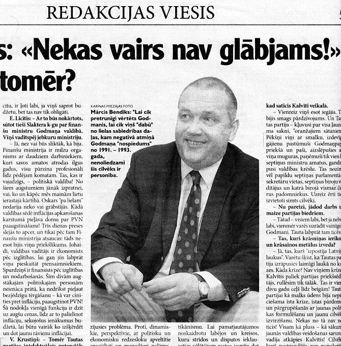 Под таким интригующим заголовком на склоне ушедшего года Latvijas aviize опубликовала пространное интервью с Марцисом Бендиксом, экспертом в области общественных отношений, бывшим советником Андриса Шкеле, в пору премьерства последнего. Предлагаем выдержки из ответов г–на Бендикса на вопросы журналистов Волдемара Крустиньша и Эгилса Лицитиса.