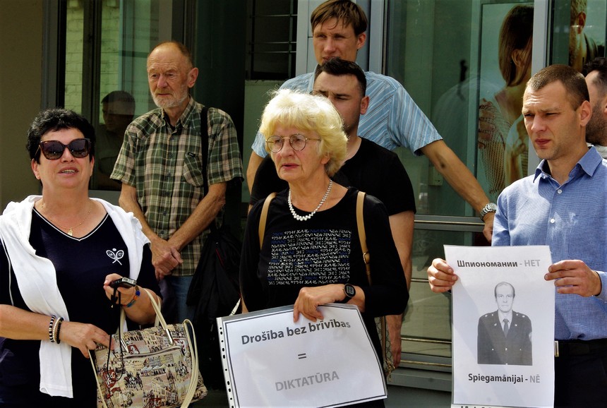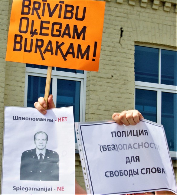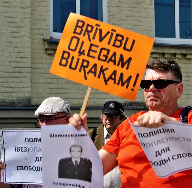 «Свободу Олегу Бураку!», «Нет шпиономании!» скандировали 12 августа участники митинга, состоявшегося у здания суда Видземского предместья Риги.