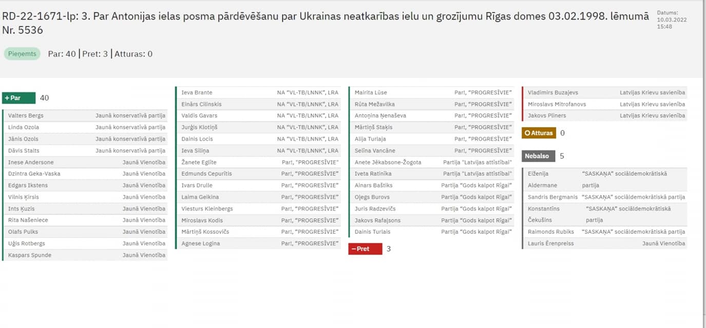 Сегодня Рижская дума проголосовала за переименование части улицы Антонияс в улицу Независимости Украины. Наши депутаты Рижской думы предложение не поддержали.