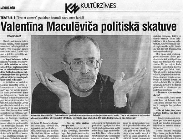 В Latvijas aviize было опубликовано интервью Виты Крауи с Валентином Мацулевичем, режиссером недавно созданного политического театра Pro et contra. Интересно, как латышский художник, в данном случае – театральный режиссер, оценивает политическую ситуацию и нравственную атмосферу в стране? Вот несколько фрагментов из интервью с Валентином Мацулевичем.