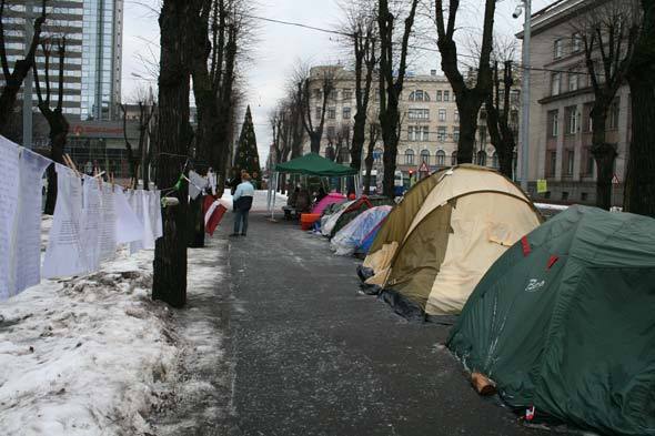 Все ждали, чем закончится замысел первого жителя палаточного городка, что в аллее напротив Кабинета министров, Гинтса Гайкенса. Он вознамерился 13 января подняться на подъемнике к окну Айнарса Шлесерса, чтобы посмотреть, чем же там занимается вице–мэр столицы, а также поинтересоваться, когда же тот предложит рижанам обещанные 5 тысяч рабочих мест. Подъемник действительно объявился у думы, полиция не мудрствуя лукаво повязала Гинтса и затолкала его в полицейскую машину. Тем все и кончилось.