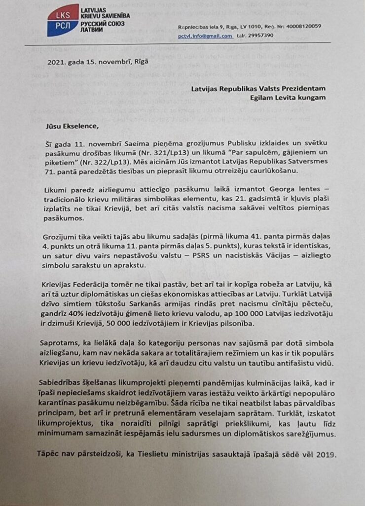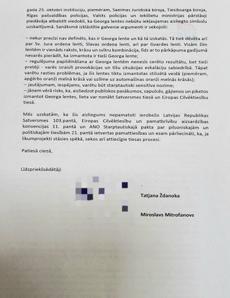 Сегодня мы передали президенту Эгилсу Левитсу обращение нашей партии с призывом не подписывать недавно принятые Сеймом поправки к закону “О собраниях, шествиях и пикетах” о запрете на использование георгиевских ленточек.