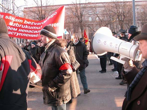 На этот раз, традиционно встретившись «у Барклая», протестующие против «нового крепостного права на окраине новой Европы», решили не ограничиваться традиционным маршрутом — к Сейму или к Рижской думе. Колонна из нескольких сотен человек прошла по улицам центральной части города, как раз под окнами своих потенциальных сторонников и, соответственно, владельцев домов. Возле одного из таких зданий, что на Лачплеша, 7, состоялся импровизированный митинг. Этот дом вместе с живущими в нем людьми несколько раз перепродавался. Что сопровождалось типичным, к сожалению, «хозяйским беспределом». Было несколько остановок-митингов и дальше: около Верховного суда, перед входом в Кабинет министров, возле столичной думы и напротив Сейма.
